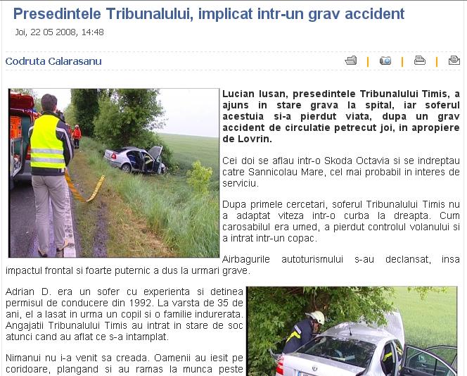 Lucian Iusan soforje a helyszinen eletet vesztette, a torvenyszeki elnok sulyos mellkasi es fejserulesekkel k...