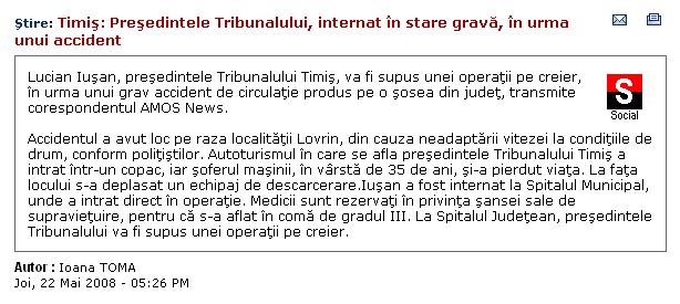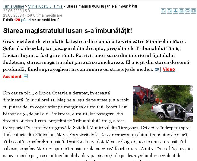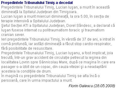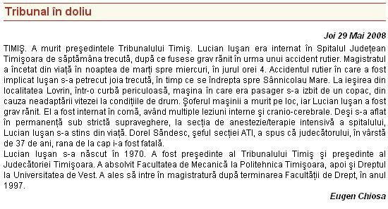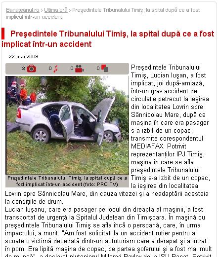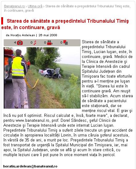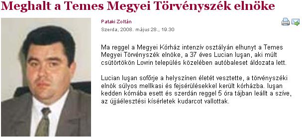 Ma reggel a Megyei Korhaz intenziv osztalyan elhunyt a Temes Megyei Torvenyszek elnoke, a 37 eves Lucian Iusan, aki mult csutortokon Lovrin telepules kozeleben autobaleset aldozata lett.