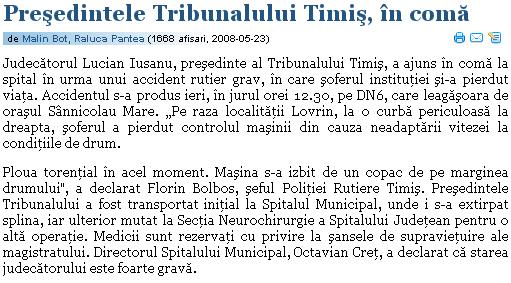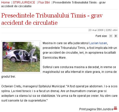 TIMIS. Presedintele Tribunalului Timis, Lucian Iusan, a ajuns la spital in coma de gradul 3 din cauza unui accident rutier, in urma caruia soferul masinii a decedat.