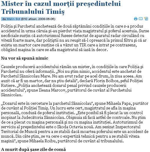 Politia si Parchetul ancheteaza de doua saptamani conditiile in care s-a produs accidentul in urma caruia si-au pierdut viata magistratul si soferul acestuia. Surse neoficiale sustin ca autoturismul fusese detectat de aparatul radar circuland cu viteza foarte mare, dar politistii nu au reusit sa-l o...