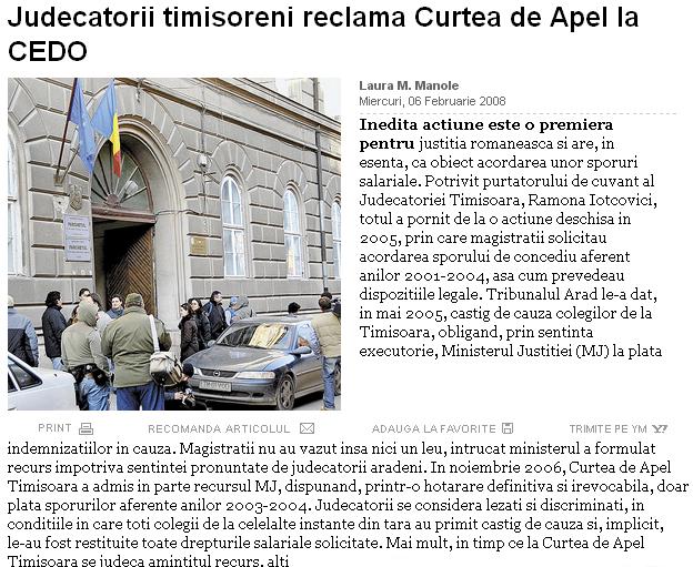 Inedita actiune este o premiera pentru justitia romaneasca si are, in esenta, ca obiect acordarea unor sporuri salariale. Potrivit purtatorului de cuvant al Judecatoriei Timisoara, Ramona Iotcovici, totul a pornit de la o actiune deschisa in 2005, prin care magistratii solicitau acordarea sporului d...