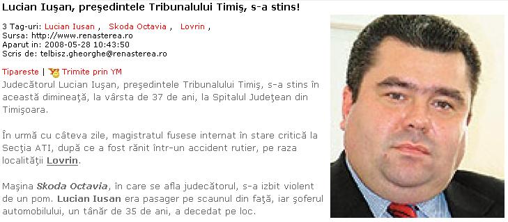 TIMISOARA - Magistratului Lucian Iusan, implicat, saptamana trecuta, intr-un grav accident de circulatie, a decedat in aceasta noapte, la Spitalul Judetean Timis.
