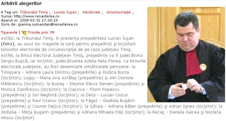 Astazi, la Tribunalul Timis, in prezenta presedintelui Lucian Iusan (foto), au avut loc tragerile la sorti pentru presedintii si loctiitorii birourilor electorale de circumscriptie de pe raza judetului Timis. Astfel, la Biroul Electoral Judetean Timis, presedinte va fi judecatorul Sergiu Busca, iar ...
